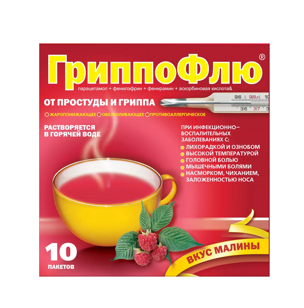 ГриппоФлю от простуды и гриппа порошок для приготовления раствора для приема внутрь со вкусом малины пакет 13г №10