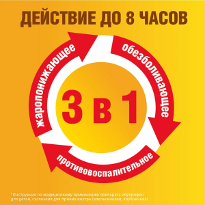 Только для кратковременного применения. Внимательно прочтите инструкцию перед приёмом препарата. Перед употреблением тщательно взболтайте флакон. 5 ;мл препарата содержат 100 ;мг ибупрофена или в ;20 ;мг ибупрофена в ;1 ;мл.