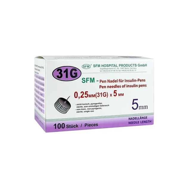 Иглы медицинские инъекционные одноразовые для инсулиновых инжекторов (ПЕН ручек) 31G (0,25ммх5мм) SFM №100