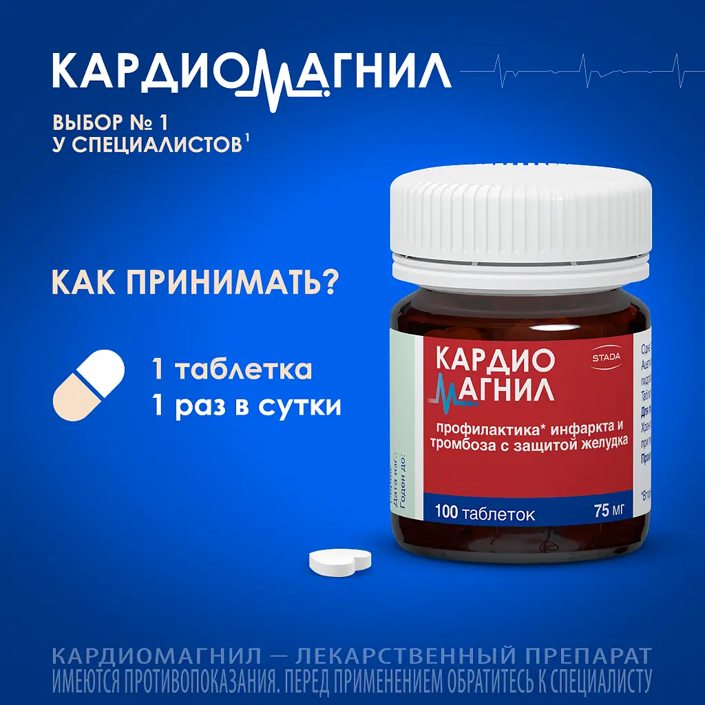 1 таблетка Кардиомагнила, содержащего АСК в дозе 150 мг в первые сутки, затем по 1 таблетке Кардиомагнила, содержащего АСК в дозе 75 мг 1 раз в сутки.