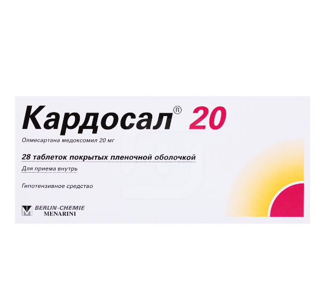 Олмесартана медоксомил — действующее вещество препарата Кардосал® 20 — является мощным специфическим антагонистом рецепторов ангиотензина II (типа АТ1) для приёма внутрь. Ангиотензин II является первичным вазоактивным гормоном ренин-ангиотензин — альдостероновой системы и играет значимую роль в патофизиологии артериальной гипертензии путём воздействия на АТ1-рецепторы. Предполагается, что олмесартан блокирует все действия ангиотензина II, опосредованные АТ1-рецепторами, независимо от источника и пути синтеза ангиотензина II. Специфический антагонизм олмесартана в отношении ангиотензина II (типа АТ1) приводит к увеличению активности ренина, ангиотензина I и II в плазме крови, а также способствует уменьшению плазменной концентрации альдостерона. При артериальной гипертензии олмесартан вызывает дозозависимое продолжительное снижение артериального давления (АД). Не имеется доказательных данных о развитии артериальной гипотензии после приёма первой дозы препарата, о тахифилаксии во время длительного лечения или о синдроме «отмены» (резкое повышение АД после отмены препарата).