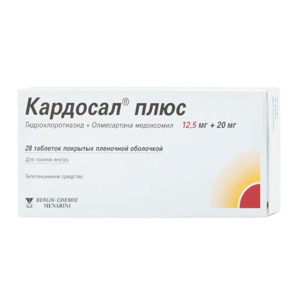 Кардосал® плюс — это комбинированный препарат, в состав которого входят антагонист рецепторов ангиотензина II (олмесартана медоксомил) и тиазидный диуретик (гидрохлоротиазид). Сочетание двух действующих веществ обладает комбинированным антигипертензивным действием, вследствие чего артериальное давление (АД) снижается в большей степени, чем при приёме каждого из них в отдельности. При приёме препарата один раз в сутки достигается эффективное и равномерное снижение АД в течение 24 ч.