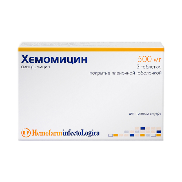 После приема внутрь Хемомицина в дозе 500 мг Cmax азитромицина в плазме крови достигается через 2.5-2.96 ч и составляет 0.4 мг/л. Биодоступность составляет 37%.