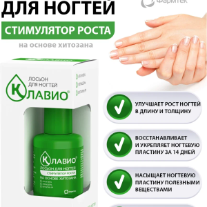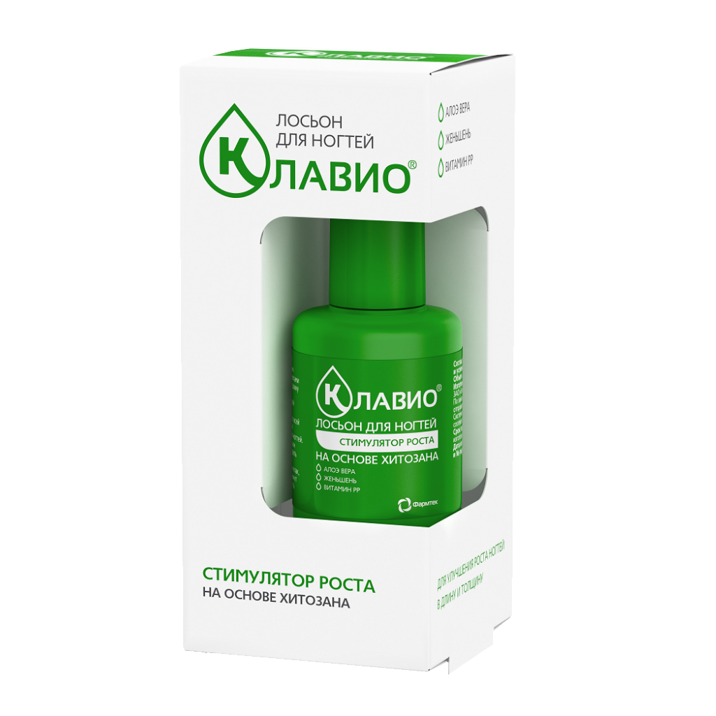 Основой лосьона КЛАВИО является водорастворимый хитозан– биологический полимер, способствующий выравниванию структуры ногтевой пластины и защищающий ее от проникновения внешних агрессивных веществ и потери влаги.