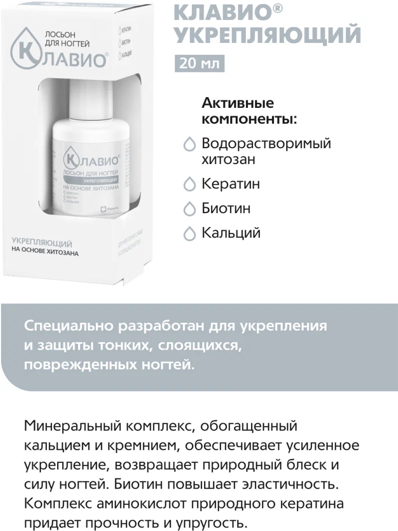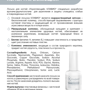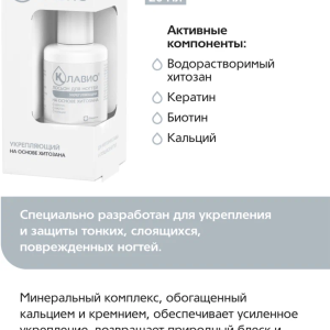Лосьон для ногтей «Укрепляющий» КЛАВИО специально разработан врачами-дерматологами для укрепления и защиты слоящихся, слабых и поврежденных ногтей.