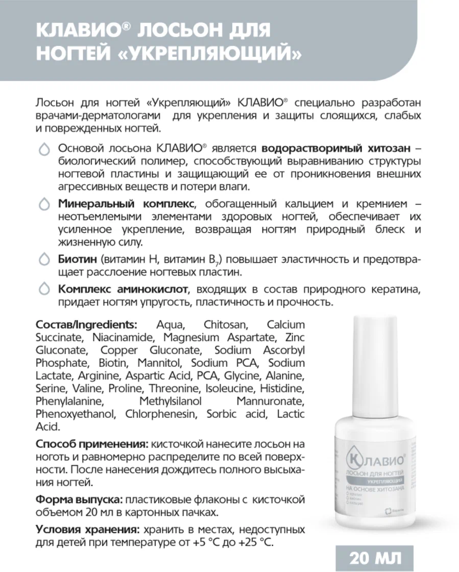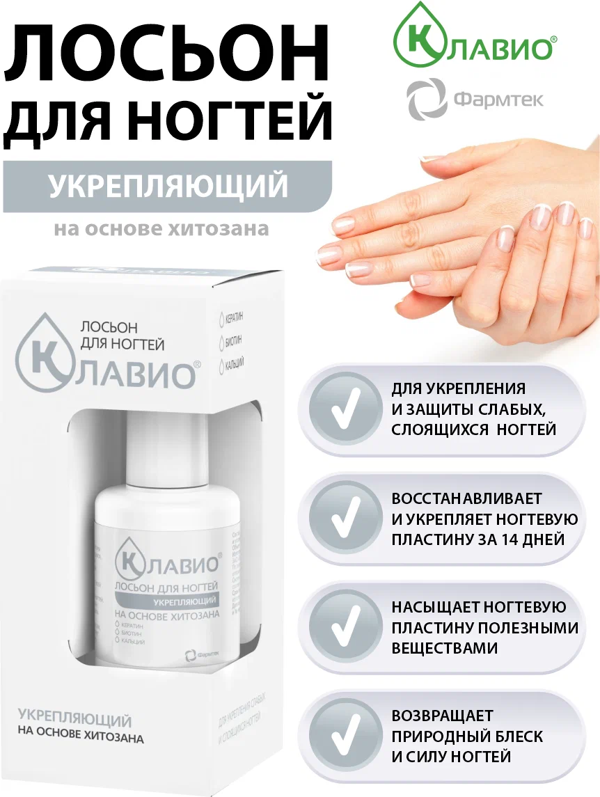 Основой лосьона КЛАВИО является водорастворимый хитозан – биологический полимер, способствующий выравниванию структуры ногтевой пластины и защищающий ее от проникновения внешних агрессивных веществ и потери влаги.