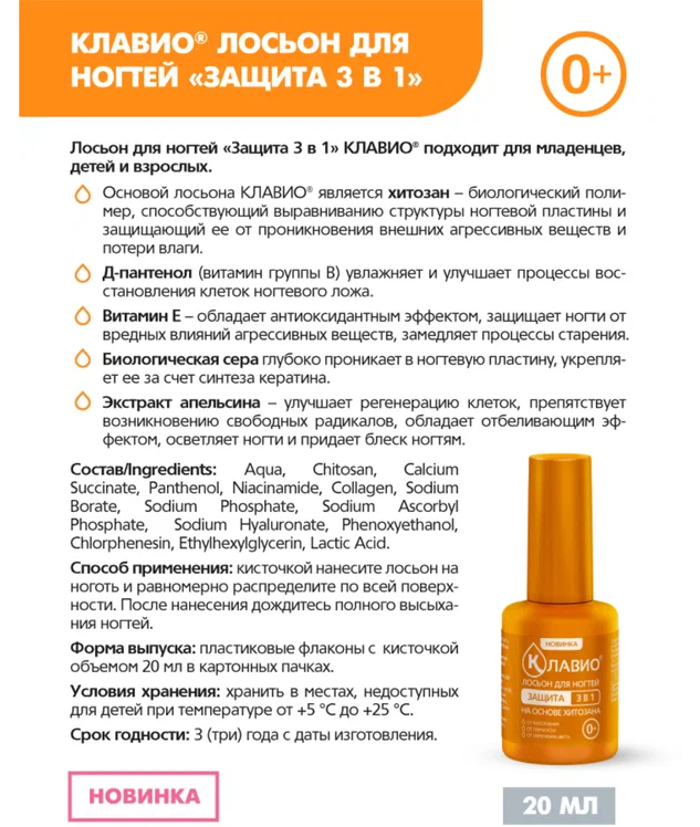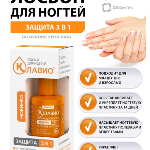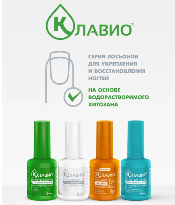 Основой лосьона КЛАВИО® является хитозан – биологический полимер, способствующий выравниванию структуры ногтевой пластины и защищающий ее от проникновения внешних агрессивных веществ и потери влаги.
