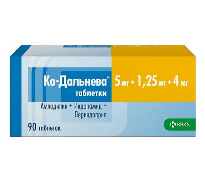Ко-Дальнева® — комбинированный препарат, содержащий периндоприла эрбумин (ингибитор ангиотензинпревращающего фермента (А11Ф)), индапамид (тиазидоподобный диуретик) и амлодипин (блокатор «медленных» кальциевых каналов (ВМКК)).
