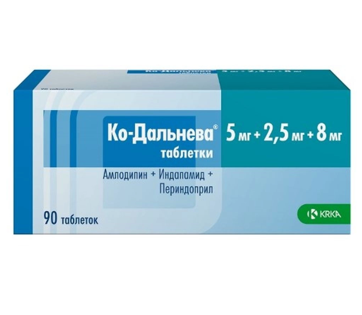 Ко-Дальнева® — комбинированный препарат, содержащий периндоприла эрбумин (ингибитор ангиотензинпревращающего фермента (А11Ф)), индапамид (тиазидоподобный диуретик) и амлодипин (блокатор «медленных» кальциевых каналов (ВМКК)).