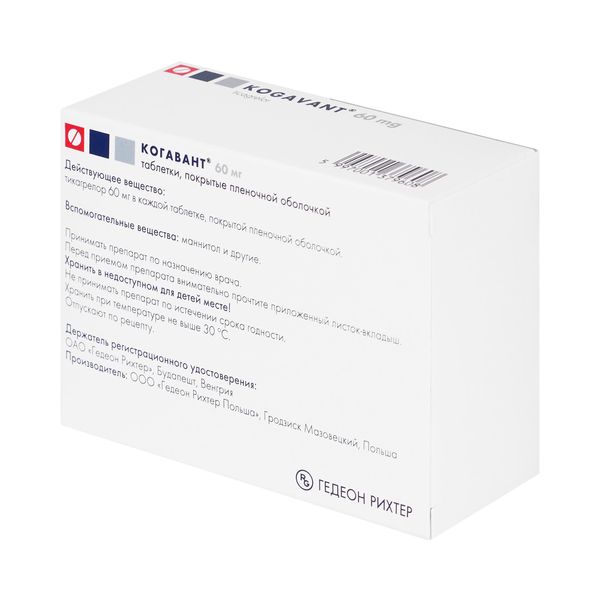 Препарат Когавант® содержит действующее вещество тикагрелор. Он относится к группе так называемых антитромботических средств, антиагрегантов (кроме гепарина).
