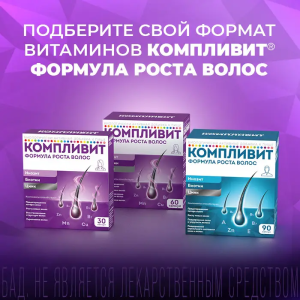 «КОМПЛИВИТ® ;Формула роста волос» ;рекомендуется в качестве биологически активной добавки к пище - дополнительного источника витаминов (С, Е, А, В5, В6, биотина), инозита и минеральных веществ (цинка, меди, марганца), комплексно способствующих поддержанию нормального состояния волос и снижению риска их выпадения.
