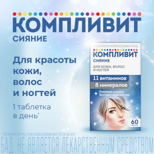 КОМПЛИВИТ® СИЯНИЕ представляет собой комплекс витаминов, минералов, витаминоподобных веществ и экстракта зеленого чая. Использование комплекса помогает улучшить состояние кожи, ногтей и волос, особенно в условиях неблагоприятной городской экологии. Действие комплекса обусловлено свойствами входящих в его состав компонентов.