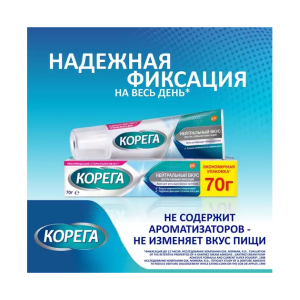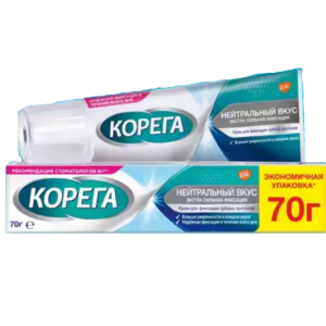 Крем Корега Нейтральный вкус входит в линейку нейтральных средств для фиксации зубных протезов Корега. Не содержит цинк и искусственные красители.