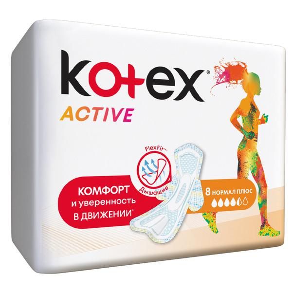 Прокладки Kotex® Active Normal защитят от протеканий даже при интенсивных нагрузках. Благодаря технологии FlexFitTM они гибкие и надёжно прилегают к телу, а центр Fast Absorb быстро впитывает жидкость, не позволяя ей добраться до краёв.