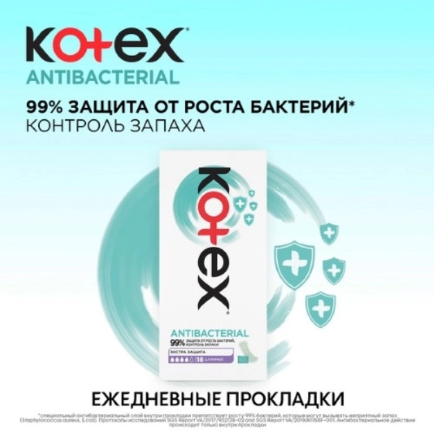 *Специальный антибактериальный слой внутри прокладки препятствует росту 99% бактерий, которые могут вызывать неприятный запах (Staphylococcus aureus, E.coli). Протоколы исследований SGS Report VA/2017/93213B-02 and SGS Report VA/2019/A1768F-001. Антибактериальное действие происходит только внутри прокладки.