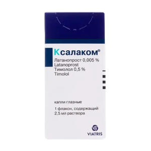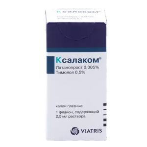 активные вещества: латанопрост — 50 мкг, тимолола малеат — 6,83 мг (эквивалентно 5 мг тимолола)