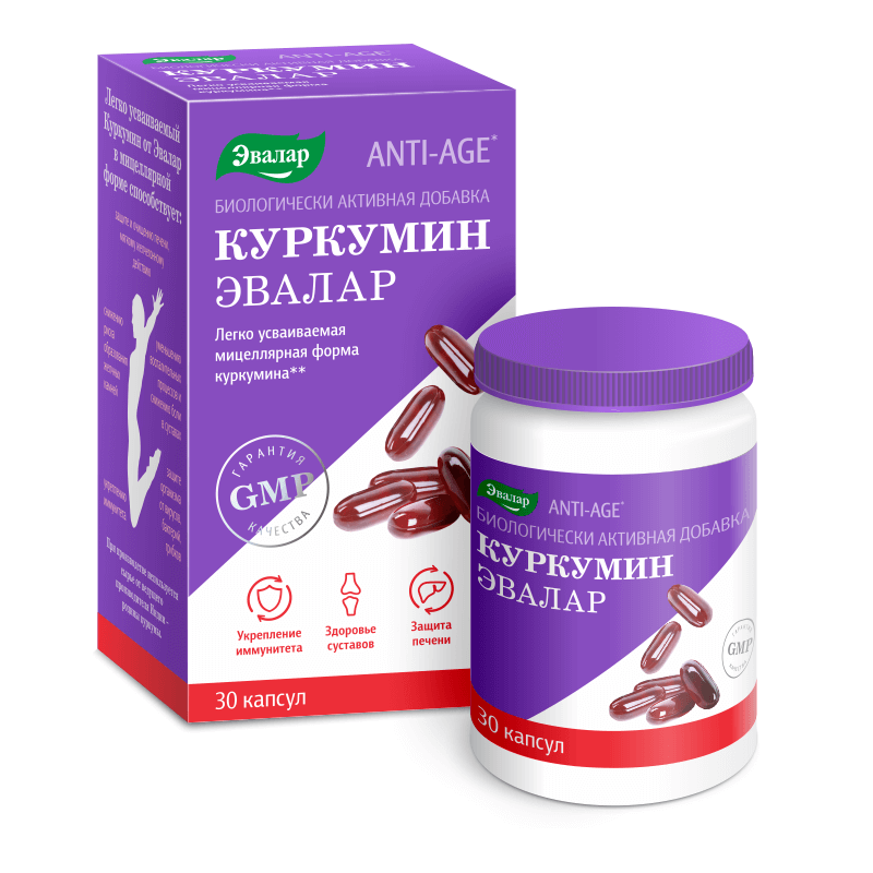 Первый1 в России легко усваиваемый «Куркумин» в мицеллярной форме выпускается компанией Эвалар.