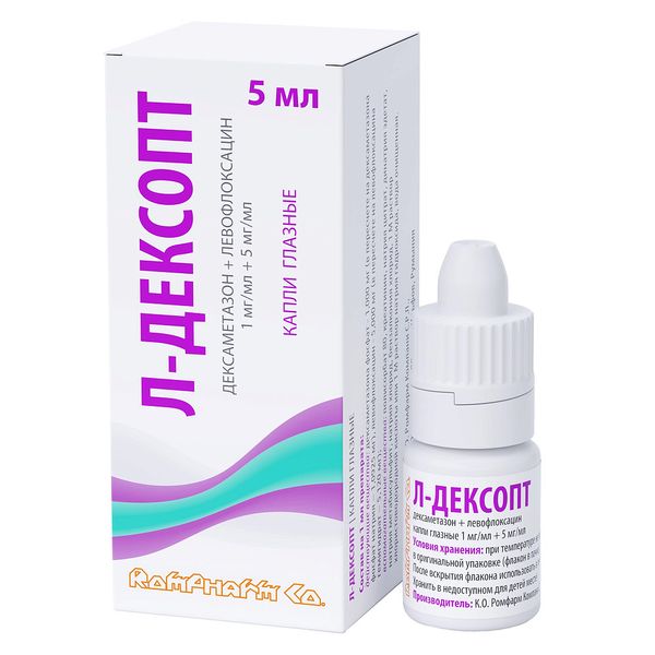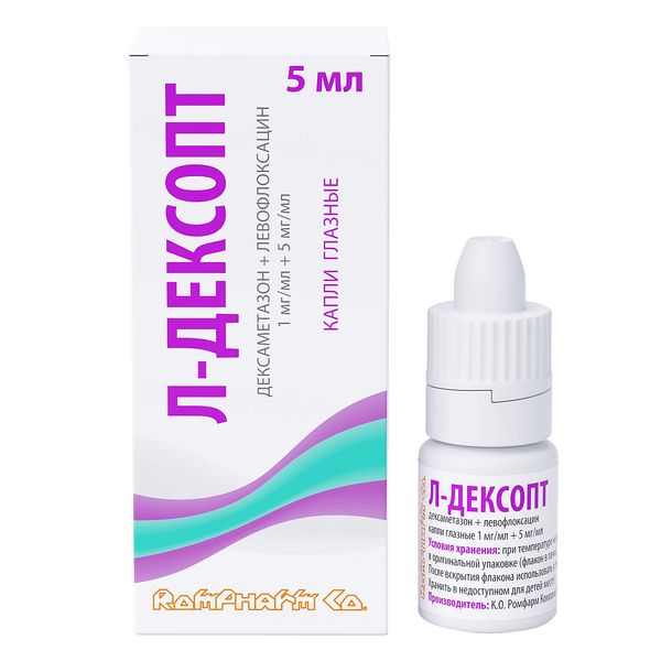 действующие вещества: дексаметазона фосфат — 1,000 мг (в пересчёте на дексаметазона фосфат натрия — 1,0925 мг), левофлоксацин — 5,000 мг (в пересчёте на левофлоксацина гемигидрат — 5,120 мг)