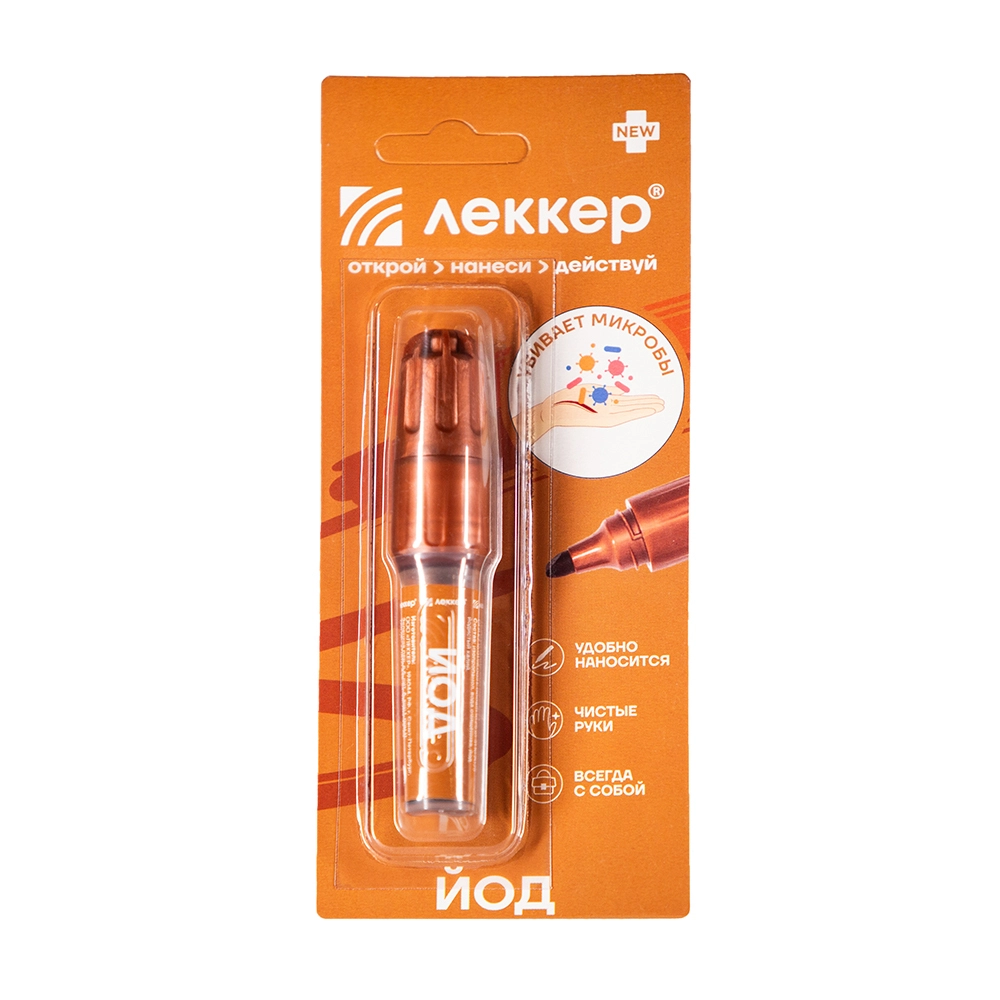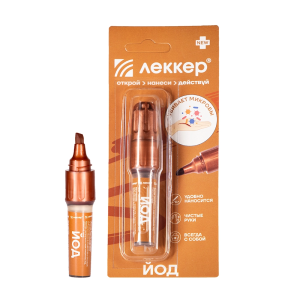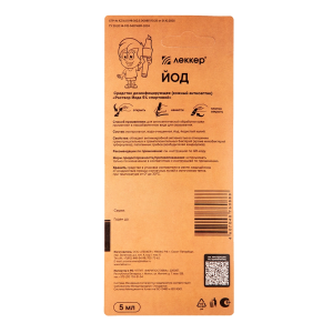 ЛЕККЕР РАСТВОР ЙОДА 5% СПИРТОВОЙ - представляет собой готовый к применению кожный антисептик в виде бесцветной прозрачной жидкости красно-бурого цвета с характерных запахом. ;