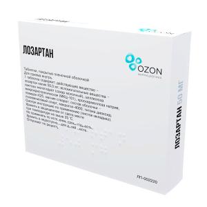 Действующее вещество: лозартан калия — 50,000 мг.
