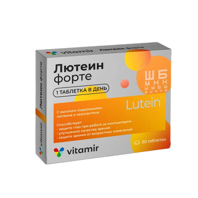 «Лютеин форте витамины для глаз ВИТАМИР®» кроме лютеина и зеаксантина содержит ряд необходимых для глаз витаминов для более эффективного воздействия и защиты, также наша добавка упакована для Вашего удобства — 1 таблетка рассчитана на восполнение в организме суточной дозы лютеина и зеаксантина, а одно упаковки хватает на месяц приема.