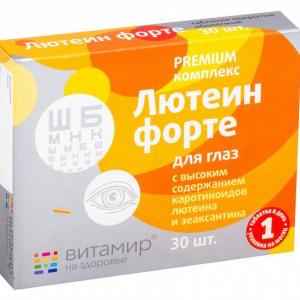 «Лютеин форте витамины для глаз ВИТАМИР®» содержит в своем составе лютеин и зеаксантин, витамины А, С, Е, рутин, цинк и селен, способствующие поддержанию функционирования органов зрения.