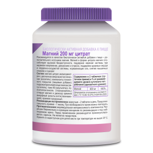 Рекомендуется в качестве биологически активной добавки к пище – дополнительного источника магния. Магний в форме цитрата магния способствует высокой биодоступности, поддержке нервной системы при нервном напряжении, депрессиях и стрессе, поддержке здоровья сердца и сердечно-сосудистой системы, нормализации сна, снятию мышечных спазмов и судорог.
