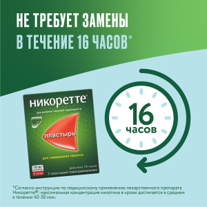 Рассчитанные по модели максимальные концентрации никотина в плазме крови соответствуют измеренным: 11 нг/мл – при применении трансдермального пластыря 10 мг и 25 нг/мл – для 25 мг. Полученное путем интерполяции значение максимальной концентрации в плазме крови при применении трансдермального пластыря 15 мг составило 16 нг/мл. Время достижения максимальной концентрации в плазме крови (tmax) составляет приблизительно 9 часов и создается во второй половине дня или к вечеру, когда риск рецидива максимален. Объем распределения после внутривенного введения никотина составляет приблизительно 2–3 л/кг, его период полувыведения – приблизительно 2–3 часа. Никотин преимущественно выводится печенью, средний плазменный клиренс – около 70 л/час. Никотин также метаболизируется в почках и легких. Идентифицировано более 20 метаболитов никотина, активность которых уступает активности исходного вещества. Связь никотина с белками плазмы составляет менее 5%. В связи с этим, нарушения связывания никотина при одновременном применении других препаратов или изменения содержания белков плазмы при различных заболеваниях не должны оказывать существенного влияния на кинетику никотина. Основной метаболит никотина – котинин – имеет период полувыведения 15–20 часов и обнаруживается в плазме крови в концентрации, превышающей таковую никотина в 10 раз. Основными метаболитами никотина, выделяющимися с мочой, являются котинин (12% введенной дозы) и транс-3-гидрокси-котинин (37% введенной дозы). Приблизительно 10% никотина экскретируется с мочой в неизмененном виде. При высокой скорости фильтрации и pH мочи ниже 5 количество никотина, выводимого с мочой в неизменном виде, может достигать 30%. Прогрессирование почечной недостаточности может сопровождаться снижением общего клиренса никотина. У курильщиков с сопутствующей хронической почечной недостаточностью, получавших лечение гемодиализом, наблюдалось повышение концентрации никотина в плазме крови. Фармакокинетика никотина при печеночной недостаточности легкой степени (5 баллов по шкале Чайлд-Пью) не изменяется, при печеночной недостаточности средней степени (7 баллов по шкале Чайлд-Пью) снижается клиренс никотина. Незначительное снижение общего клиренса никотина отмечалось у здоровых пациентов пожилого возраста, что, однако, не требует коррекции его дозы. Концентрация никотина в плазме крови возрастает при применении трех видов трансдермальных пластырей пропорционально дозе. Различий в фармакокинетике никотина у мужчин и женщин не наблюдалось.