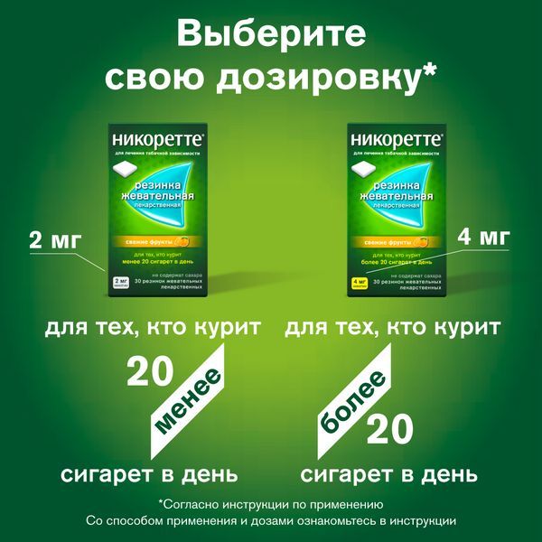 - жевательной резинкой «Никоретте® » 4 мг (повышенное содержание никотина) следует пользоваться, если Вы выкуриваете более 20 сигарет в день или Вам не удалось бросить курить при использовании жевательной резинки в дозе 2 мг.