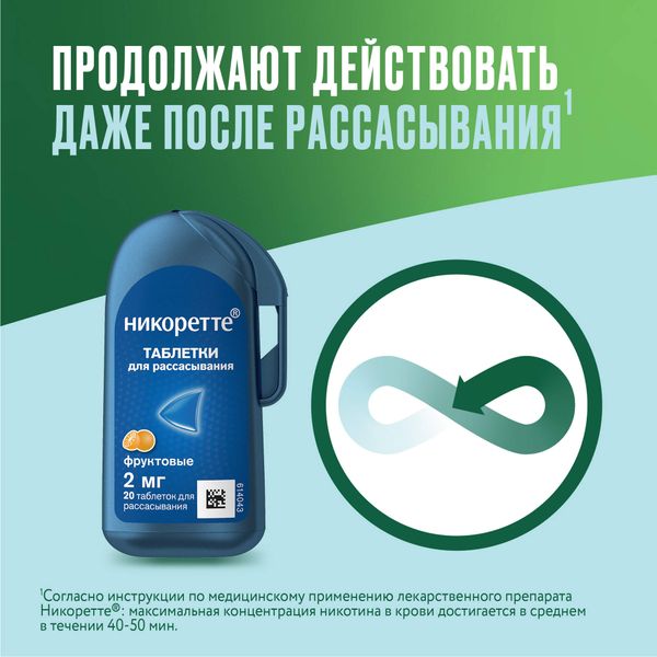 Таблетки для рассасывания полностью растворяются в полости рта. Все количество никотина, содержащееся в таблетке для рассасывания, всасывается трансбуккально или проглатывается. Биодоступность никотина, проглоченного вместе со слюной, снижается из-за первичного метаболизма. Следовательно, при жевании, удержании во рту и последующем проглатывании или жевании и немедленном проглатывании таблеток для рассасывания всасывание никотина замедляется и снижается. Максимальная концентрация никотина в плазме крови, равная 5 нг/мл для таблеток для рассасывания 2 мг, и 8 нг/мл - для таблеток для рассасывания 4 мг, достигается в среднем в течение 40 и 50 мин, соответственно. Таблетки для рассасывания полностью растворяются в течение 16 – 19 минут.