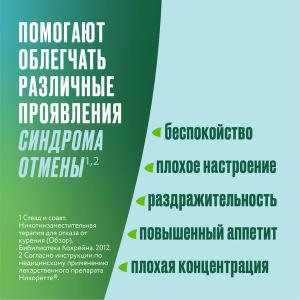 Полициклические ароматические углеводороды, содержащиеся в табачном дыме, индуцируют метаболизм препаратов, метаболизируемых изоферментом CYP1A2 (и возможно СYP1A1). Прекращение курения может вызывать замедление метаболизма и, как следствие, увеличение концентрации этих препаратов в крови. Это имеет потенциальное клиническое значение для препаратов с узким терапевтическим индексом - например, теофиллина, такрина, клозапина и ропинирола. В дно флакона встроена ячейка, содержащая гранулы влагопоглотителя - силикагеля. Не нарушать целостность ячейки, содержащей влагопоглотитель! Не проглатывать влагопоглотитель! Если лекарственное средство пришло в негодность или истек срок годности, не выбрасывайте его в сточные воды или на улицу. Поместите лекарственное средство в пакет и положите в мусорный контейнер. Эти меры помогут защитить окружающую среду. Применение Никоретте® сопровождается меньшим риском, чем курение!