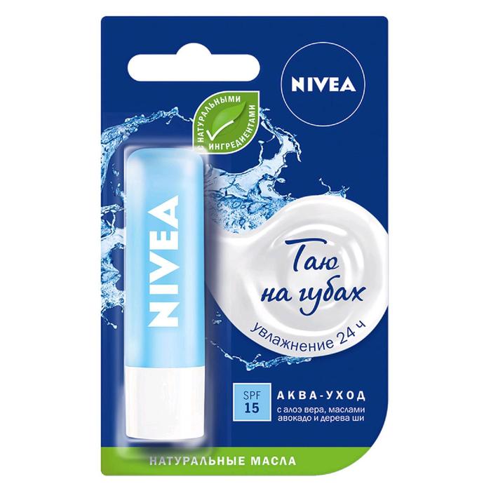 Хотите, чтобы губы оставались увлажненными 24 часа*? Попробуйте Бальзам для губ "Аква-уход" от NIVEA с усовершенствованной' формулой, натуральным маслом дерева ши и витаминами С и Е. Легкая водостойкая формула бальзама для губ мгновенно тает на губах, придавая мягкость и гладкость, защищает губы от мороза и ветра, а наличие фактора защиты SPF 15 предохраняет от воздействия UVA/UVB излучения. Подходит для использования в любое время года, особенно в сухой летний период или холодный зимний. Гигиеническая помада ухаживает за губами, придавая им более гладкий и увлажненный вид. Натуральные масла и витамины в составе. Дерматологически протестировано.