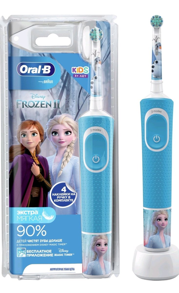 Электрическая зубная щетка Oral-B Kids для детей от 3 лет с любимыми героями мультфильма Disney "Холодное Сердце 2" обеспечивает эффективный бережный уход за полостью рта. Зубная щетка имеет два режима специально для деликатного ухода за полостью рта ребенка. В комплект входят 4 стикера с героями мультфильма Disney "Холодное Сердце 2", с помощью которых можно персонализировать зубную щетку.