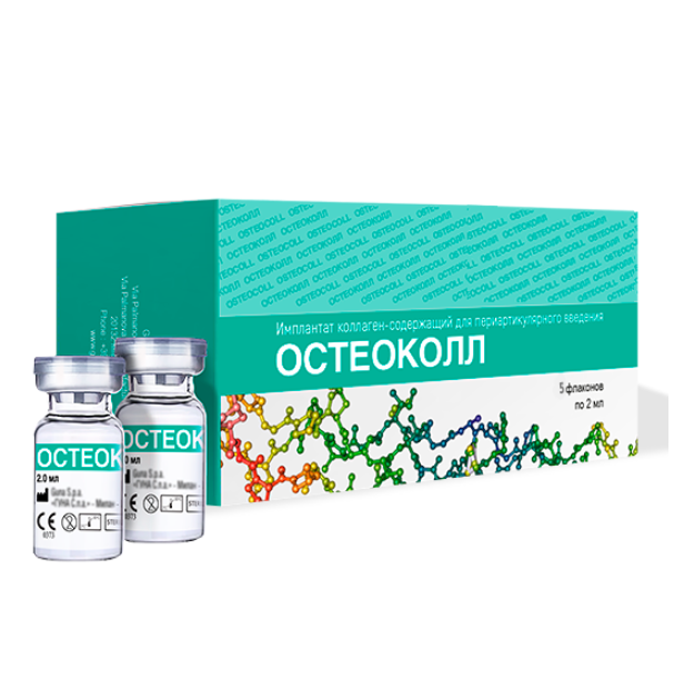ОСТЕОКОЛЛ представляет собой имплантат коллаген-содержащий для периартикулярного введения, который способствует увеличению объёма движений благодаря замедлению процессов деградации хрящевой ткани суставных поверхностей и восстановлению повреждений, возникших в результате: