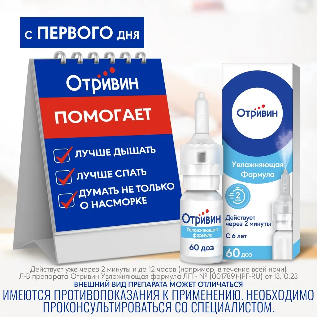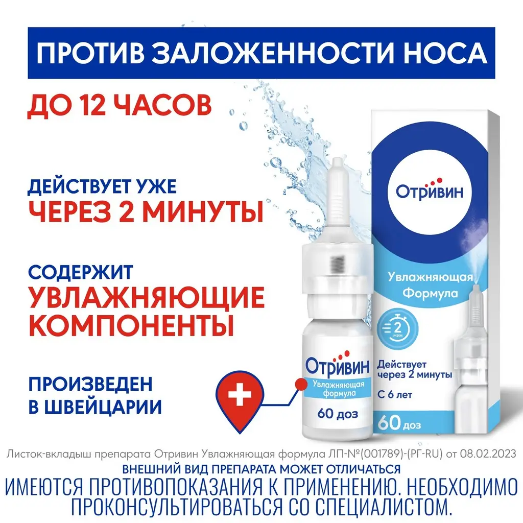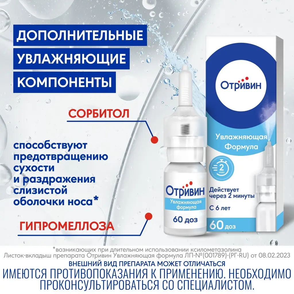 Отривин® хорошо переносится пациентами с чувствительной слизистой оболочкой, его воздействие не препятствует отделению слизи. Отривин® имеет сбалансированное значение pH, характерное для полости носа. В состав препарата входят неактивные компоненты — сорбитол и гипромеллоза (метилгидроксипропилцеллюлоза), которые являются увлажнителями. Таким образом, увлажняющая формула позволяет уменьшить симптомы раздражения и сухости слизистой оболочки носа, возникающие при длительном использовании ксилометазолина.