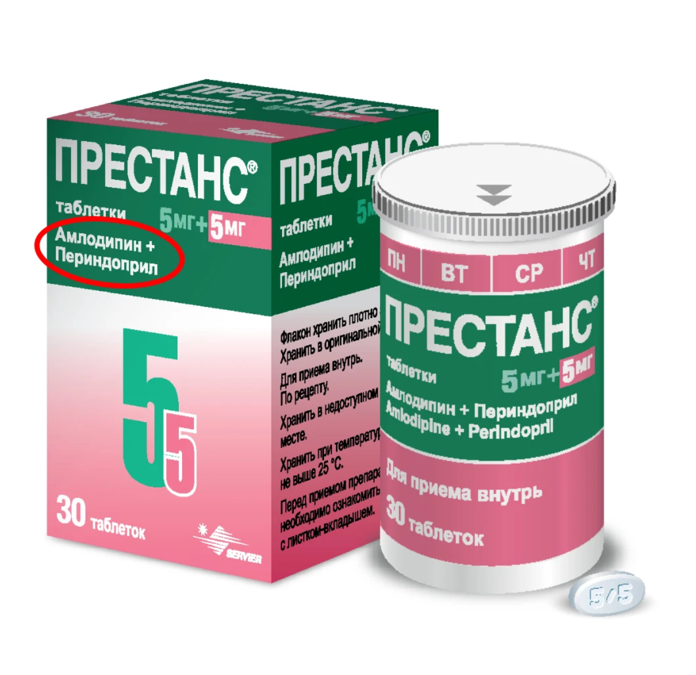 действующих веществ амлодипина безилата 6,935 мг, соответствует 5 мг амлодипина и периндоприла аргинина 5 мг, соответствует 3,395 мг периндоприла.