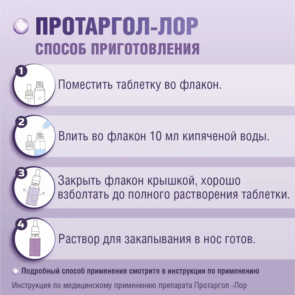 - Поместить одну таблетку Протаргол-ЛОР во флакон из темного стекла.