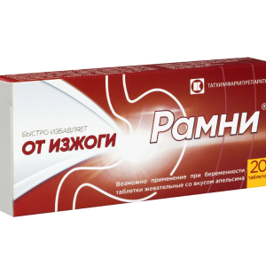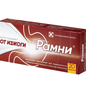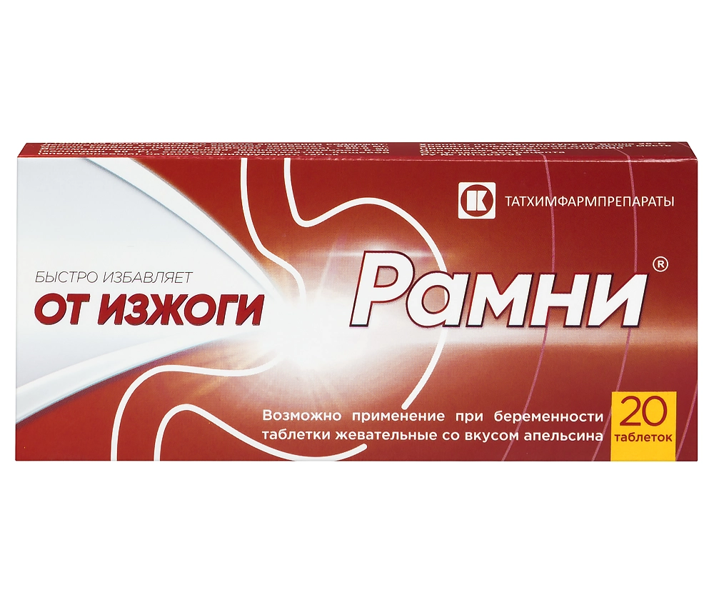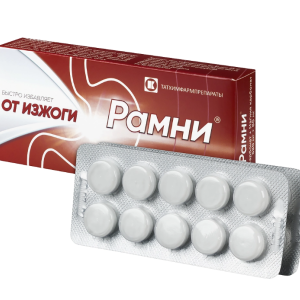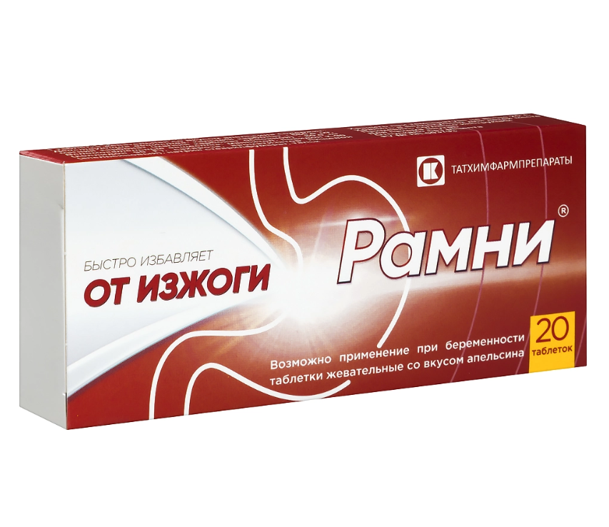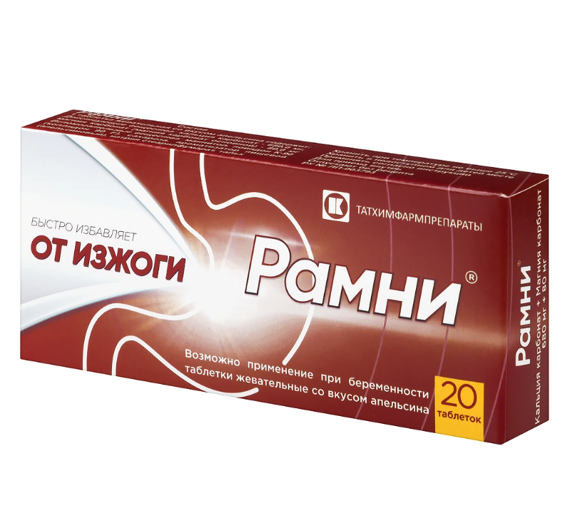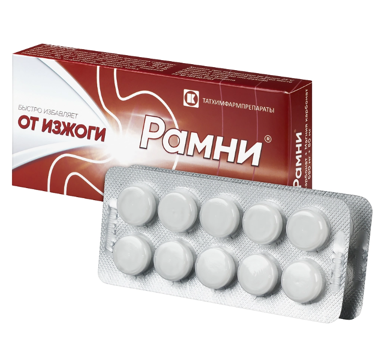Препарат Рамни® содержит антацидные вещества — кальция карбонат и магния карбонат, которые обеспечивают быструю и продолжительную нейтрализацию избыточной соляной кислоты желудочного сока, тем самым оказывает защитное действие на слизистую оболочку желудка. Достижение положительного эффекта в течение 3–5 минут обусловлено хорошей растворимостью таблеток и высоким содержанием кальция.