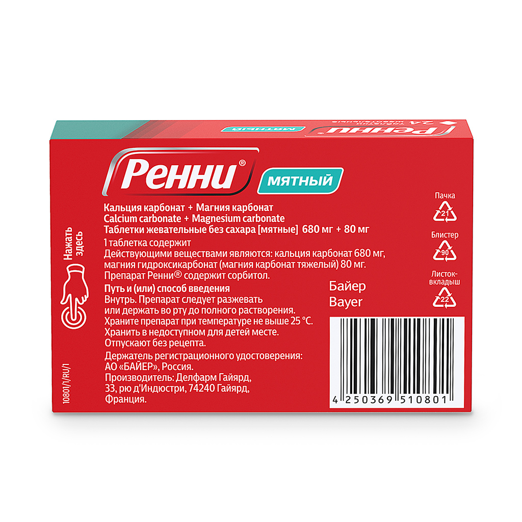 Применение Ренни® в высоких дозах может увеличить риск образования камней в почках. 5 Указание больным сахарным диабетом: 1 таблетка Ренни® содержит 400 мг сорбитола и может применяться пациентами с сахарным диабетом.