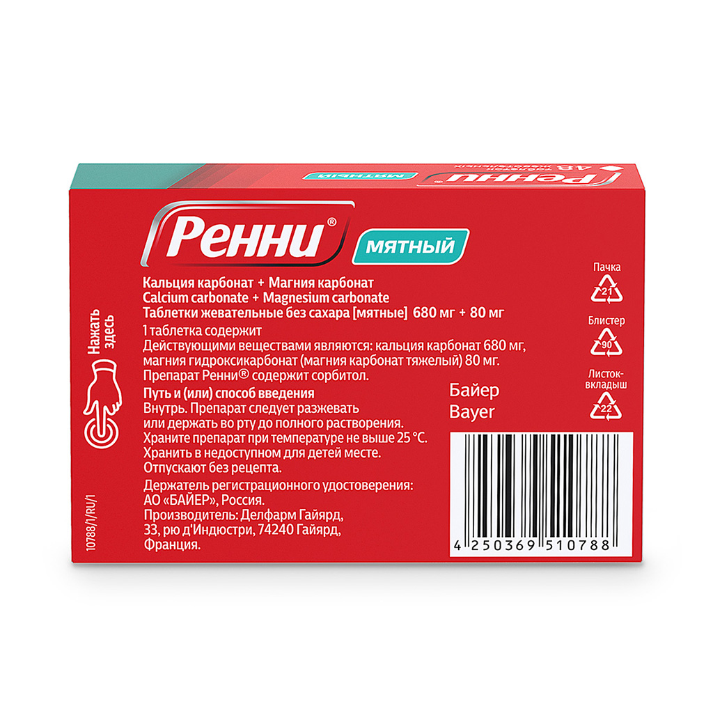Применение Ренни® в высоких дозах может увеличить риск образования камней в почках. 5 Указание больным сахарным диабетом: 1 таблетка Ренни® содержит 400 мг сорбитола и может применяться пациентами с сахарным диабетом.