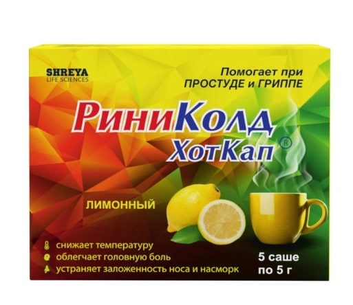 Содержимое 1 саше (пакетика) высыпать в стакан, залить горячей водой, перемешать до полного растворения и выпить (по желанию можно добавить сахар или мед). Принимать препарат РиниКолд ХотКап® необходимо с большим количеством жидкости, через 1-2 часа после приема пищи.