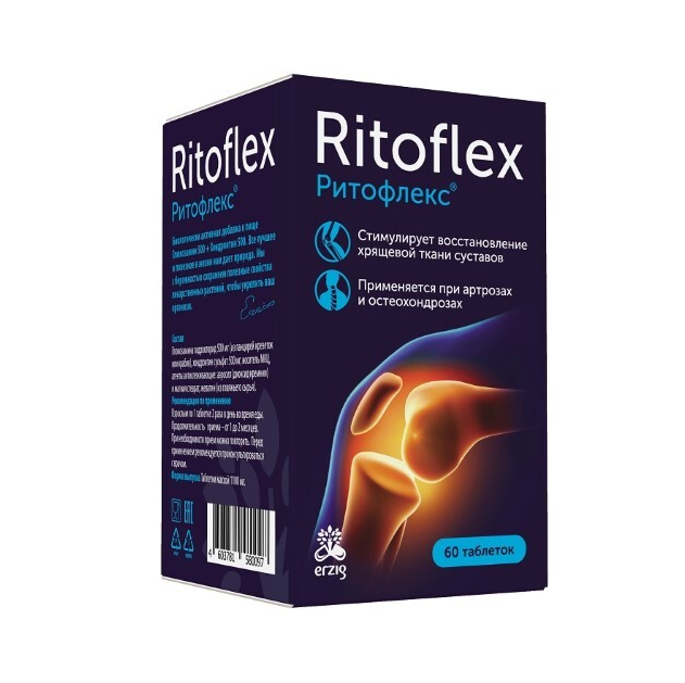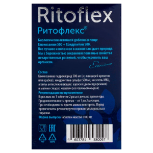 ГЛЮКОЗАМИН500+ХОНДРОИТИН500 РИТОФЛЕКС - Биологически активная добавка (БАД) к пище. Внешний вид и свойства: таблетки цилиндрической формы. Цвет от белого до серого, возможны вкрапления. Могут оставлять белый след на руках, т.к. не покрыты химической оболочкой. Содержит комплекс активных компонентов, необходимых для естественного восстановления хрящевой ткани при проблемах с суставами. Хондроитин и глюкозамин стимулируют регенерацию хрящевой ткани, а также предупреждают и замедляют процессы резорбции костной ткани.