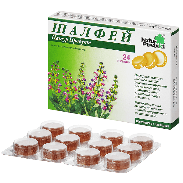 Активное вещество: Экстракт листьев шалфея лекарственного, масло шалфея, масло эвкалипта, ментол.