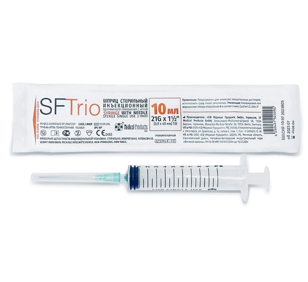 Шприц стерильный инъекционный однократного применения объемом 10мл с иглой 21G x 1 ½ (0.8 x 40 мм) SFTrio №1