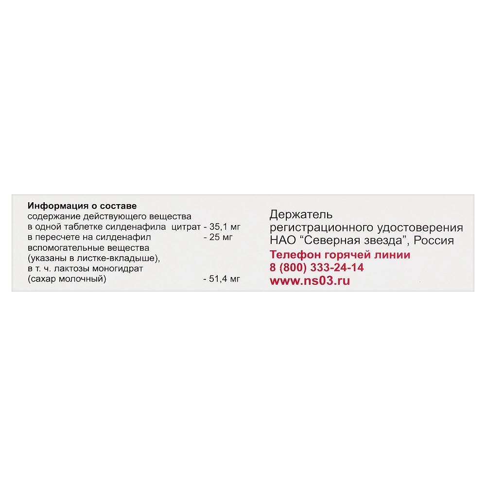активное вещество: силденафила цитрат в пересчёте на силденафил — 25 мг вспомогательные вещества (ядро): целлюлоза микрокристаллическая -