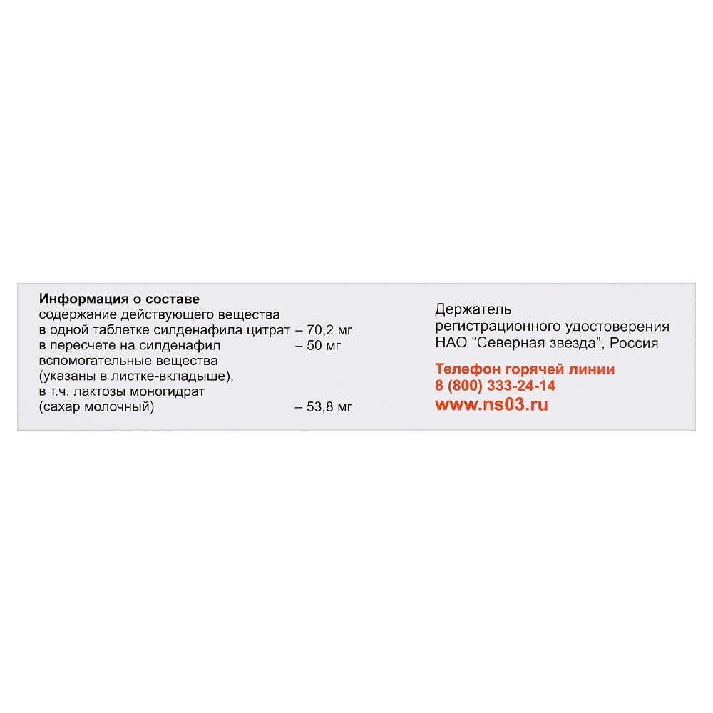 активное вещество: силденафила цитрат в пересчёте на силденафил — 50 мг вспомогательные вещества (ядро): целлюлоза микрокристаллическая -