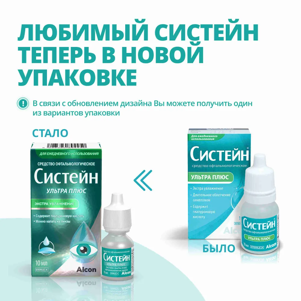 При продолжающемся дискомфорте, обильном слезотечении, изменении зрения, покраснении глаз прекратите применение СИСТЕЙН УЛЬТРА ПЛЮС и проконсультируйтесь с врачом. Средство офтальмологическое СИСТЕЙН УЛЬТРА ПЛЮС не предназначено для очистки и/или дезинфекции контактных линз.