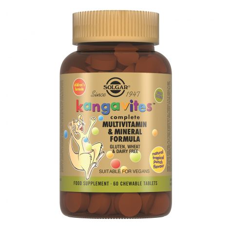 «Кангавитес®» - это инновационная серия витаминов для детей, обеспечивающая оптимальную суточную потребность детского организма в полезных витаминах, а строгий контроль качества на каждом этапе производства гарантирует высокий уровень безопасности и эффективности. \Кангавитес™. Комплексная формула мультивитаминов и минералов со вкусом тропических фруктов\ - мультивитамины для детей в жевательных таблетках, богатые витамином С, фолиевой кислотой, биотином, кальцием, магнием. Также комплекс мультивитаминов и минералов Кангавитес от Солгар содержит селен, хром и соевый лецитин. Стимулируя функции роста и развития, данный продукт снабжает организм веществами, необходимыми для развития и поддержки тканей и систем организма, содействует нормальному функционированию нервной и мышечной системы, а также улучшению памяти и мозговых функций. \Кангавитес™. Комплексная формула мультивитаминов и минералов со вкусом тропических фруктов\ выпускается в форме жевательных таблеток, подслащенных фруктозой и ароматизированных натуральными экстрактами тропических фруктов и овощей. Также данный комплекс содержащит биофлавоноиды цитрусовых, экстракты брокколи, красной свеклы, моркови, абрикосов, яблок, клубники и шиповника и удовлетворяет суточную потребность развивающегося организма в витаминах и минералах.