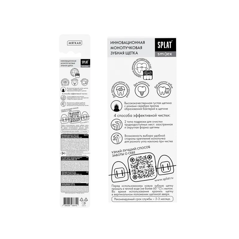 Инновационная монопучковая зубная щетка SPLAT® SMILEX ORTHO+ – необходимое дополнение к мануальной щетке для более качественной гигиены полости рта. Это щетка всего с одним пучком, состоящим из 850 щетинок. Монопучок с плотно набитой щетиной легко прочищает стенки дальних жевательных зубов, фиссуры и десневую бороздку, а также удаляет налет вокруг имплантов и других ортодонтических и ортопедических конструкций.