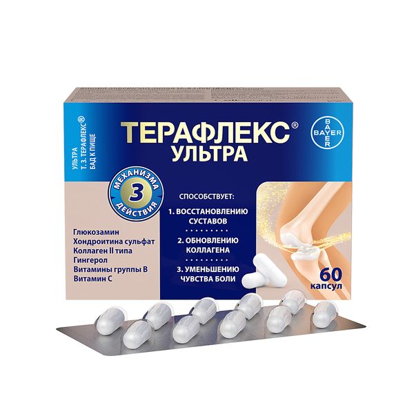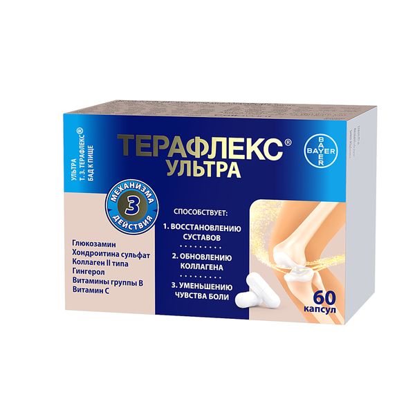 Ультра товарног о знака (т. з.)Терафлекс® биологически активная добавка (БАД) к пище способствует уменьшению чувства боли и восстановлению здоровой структуры, гибкости и подвижности суставов и позвоночника. Улучшенная формула Терафлекс® специально разработана для комплексного интенсивного воздействия на дегенеративно-дистрофические процессы в тканях суставов и позвоночника, которые развиваются при старении и воспалении.